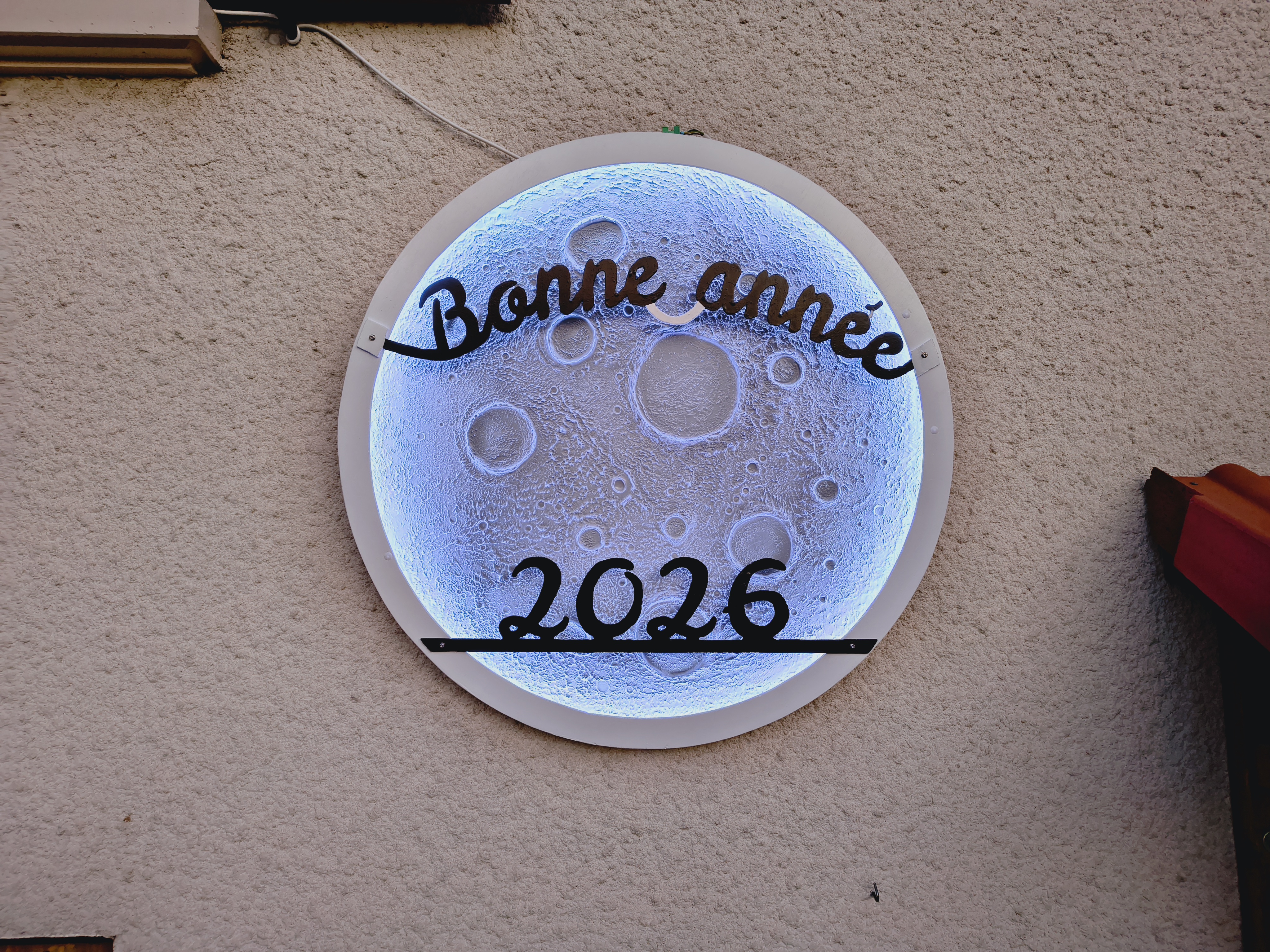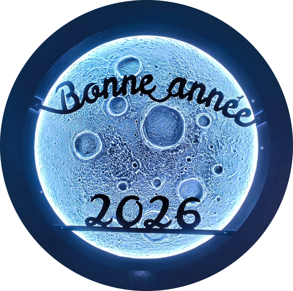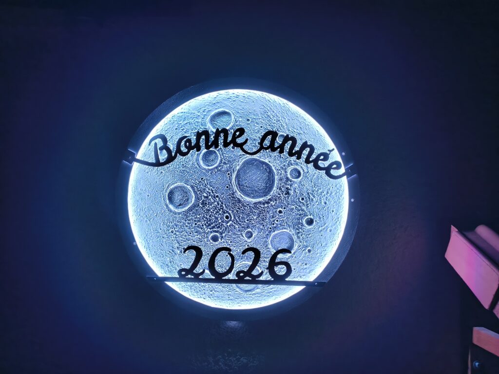 Comme annoncé dans l’article sur la fabrication de « notre » lune pour les animations d’Halloween, Noël et de début d’année, on a utilisé notre travail pour la création de notre carte de vœux 2026.