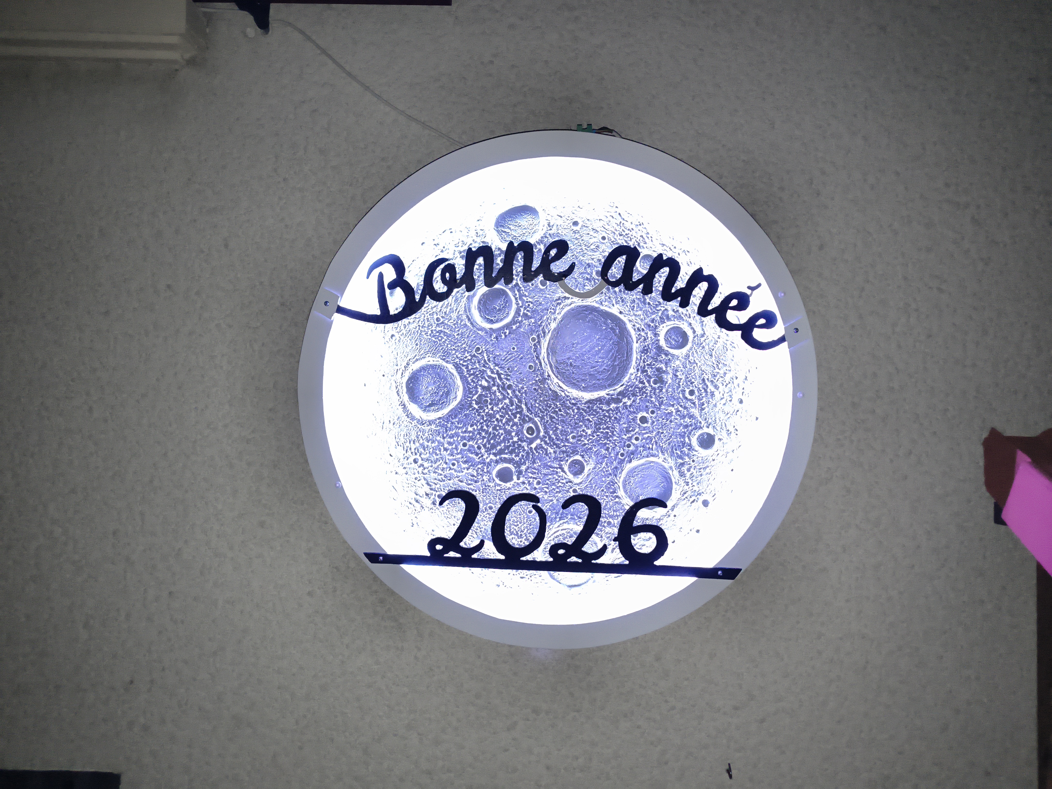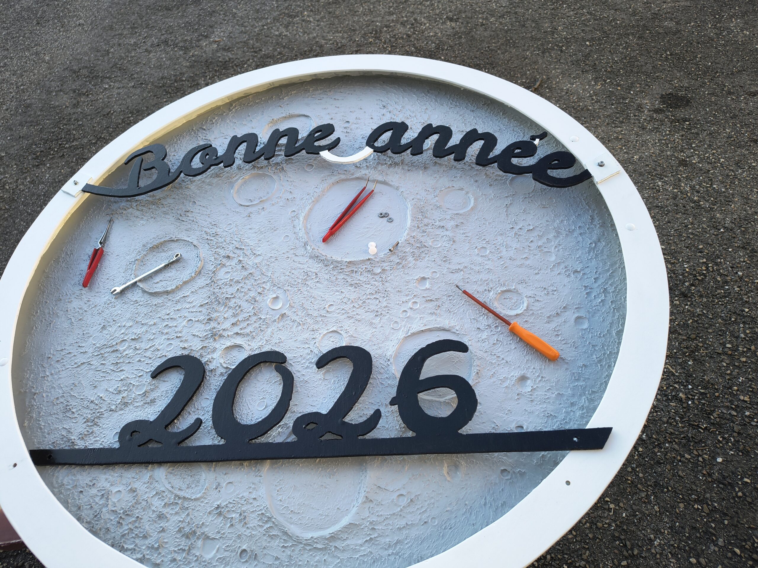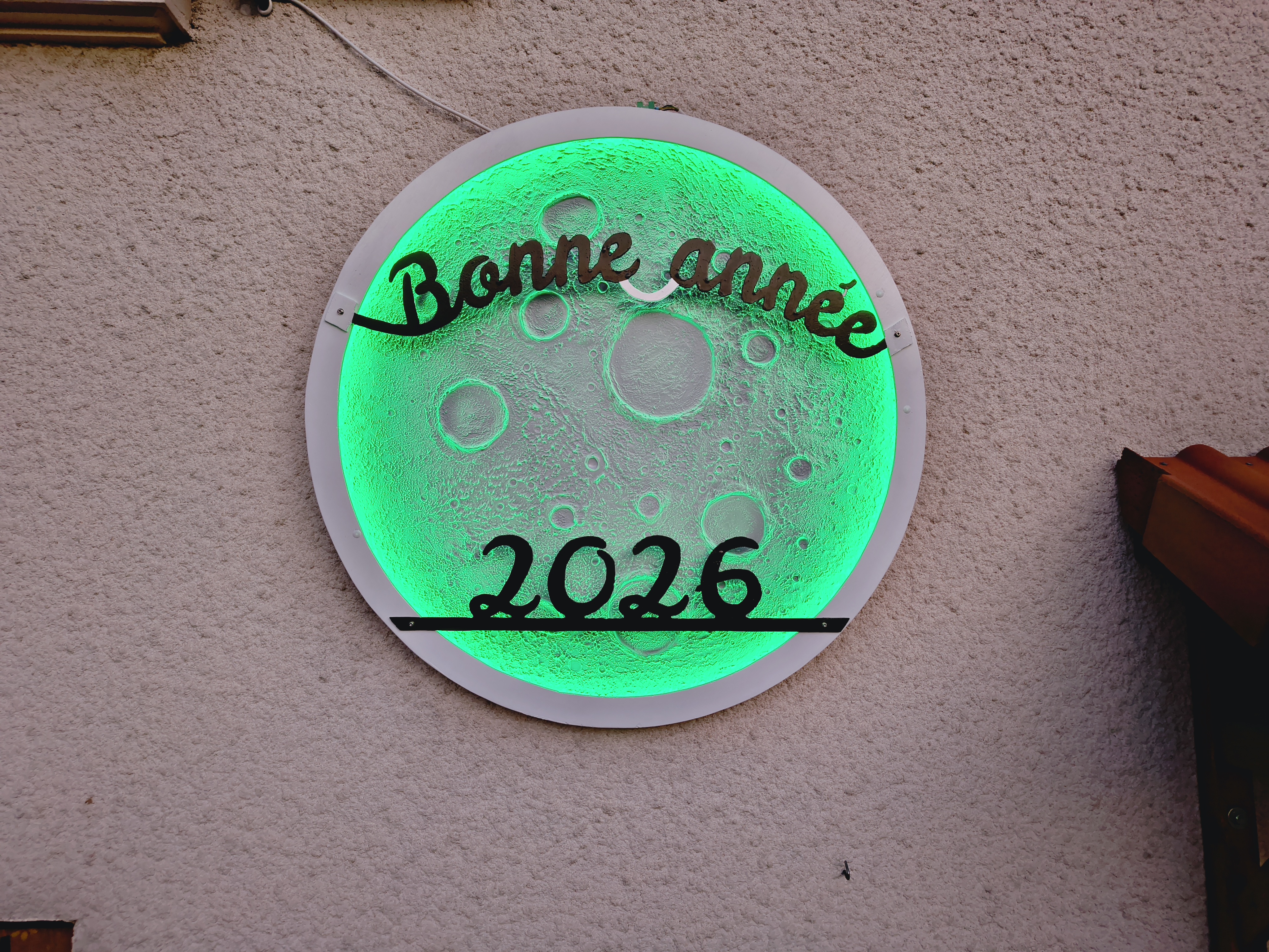 Comme annoncé dans l’article sur la fabrication de « notre » lune pour les animations d’Halloween, Noël et de début d’année, on a utilisé notre travail pour la création de notre carte de vœux 2026.