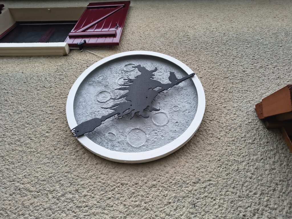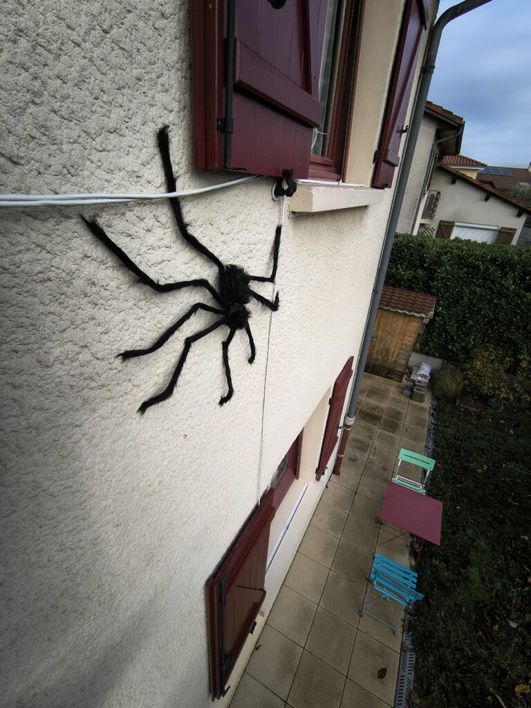 on avait des araignées, une sorcière qui se promenait au dessus du jardin, des fantômes (petits et grands), des citrouilles…